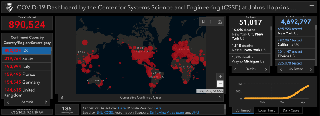 据约翰斯·霍普金斯大学实时统计数据,截至北京时间4月25日5时,美国确诊病例890524例,死亡病例51017例,均居全球最高。