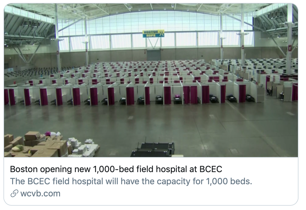 此外,两周前波士顿已经将会展中心改建成为拥有1000张床位的方舱医院,其中500张计划分配给无家可归者使用。但目前为止只有个别轻症患者入住,方舱医院整体仍处于备用状态。