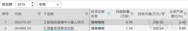 公募基金方面,2019年年报显示,持有瑞幸咖啡的公募基金有两只:工银瑞信香港中小盘人民币、汇添富全球移动互联,分别持有208.6万元、302万元,占资产净值比分别有2.49%、0.84%。