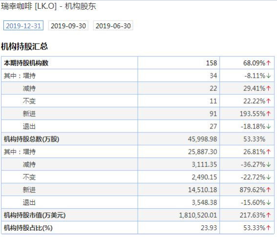 Wind数据显示,截至2019年12月31日,共有158家机构投资者持有瑞幸咖啡股票。比2019年第三季度末,新增64家机构入场,持股达4.6亿股。