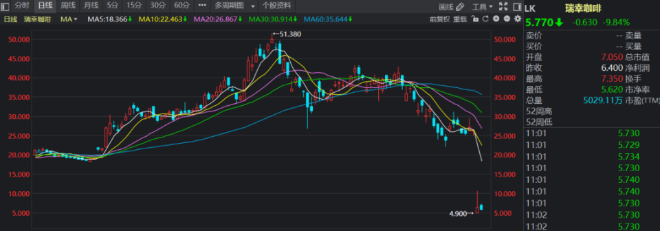 先看市值方面,昨晚瑞幸咖啡在美股跌了75.57%,跌去了50亿美元,目前,市值是16亿美元左右。截至发稿,今日继续大跌近10个点。