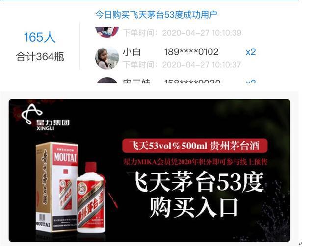 星力集团所发的生命也可以看出其对该资格的重视,专门讲到高度重视与茅台集团的合作,严格按照销售合同进行销售,并承诺每一瓶茅台酒在合同约定的销售时间内以零售价格投放市场。另外,市场上,星力百货4月6日上线的购酒活动仍在进行之中,根据星力名酒预定小程序,4月27日下午7点,当天共有165人合计成功购买364瓶飞天茅台。