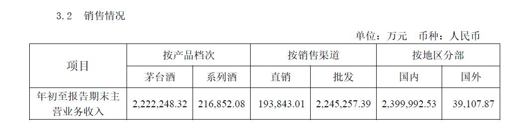 具体来看,今年1~3月,茅台酒实现营收222.22亿元,系列酒实现营收21.69亿元;按销售渠道划分,公司直营渠道营收为19.38亿元,批发渠道营收为224.53亿元;按地区划分,国内实现营收近240亿元,国外实现营收约3.91亿元。