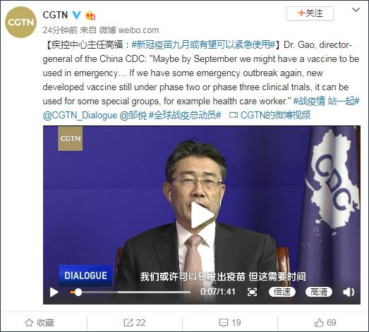 中国国际电视台消息,4月23日,中国疾控中心主任高福院士在接受中国国际电视台采访时表示:或许九月份中国就有一种可以在紧急情况下使用的疫苗,到明年初就能研发出可以用于健康人群的疫苗。
