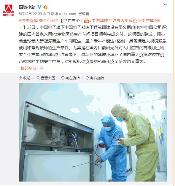 据中国电子信息产业集团有限公司官网12日消息,近日,中国电子旗下中国电子系统工程第四建设有限公司(简称中电四公司)承建的国内首家人用P3生物医药生产车间项目顺利完成交付。该项目的建成,标志着全球最大新冠疫苗生产车间诞生,量产后年产能达1亿剂,具备满足大规模紧急使用和常规接种的生产条件。尤其是在国内目前尚无针对人用疫苗的高级别生物安全生产车间的建设标准背景下,该项目的建成还填补了国内重大疫病防控在疫苗领域的生物安全空白,对新冠肺炎疫情的药品和疫苗研发意义重大。