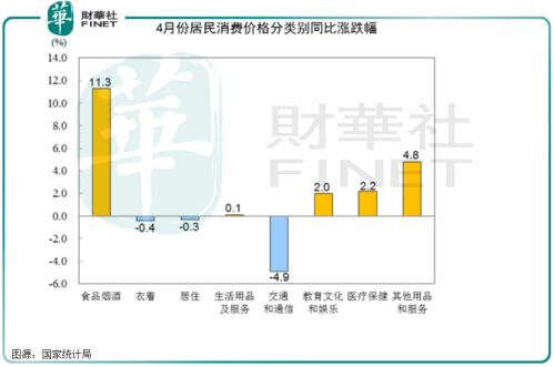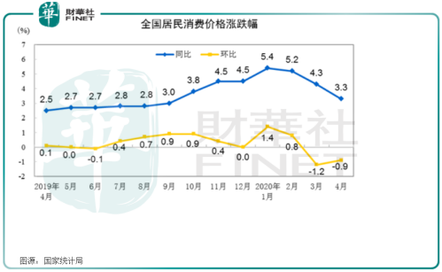 统计局数据显示,4月CPI重回“3时代”,同比上涨3.3%,环比下降0.9%。