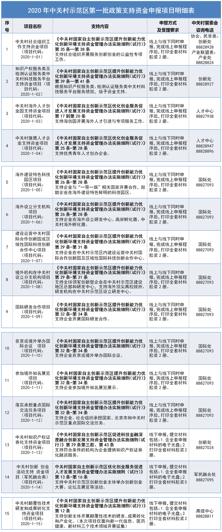 中关村管委会:2020年第一批政策支持资金项目今起申报 2020年5月15日,中关村管委会官网公布了《中关村国家自主创新示范区关于申报2020年第一批政策支持资金项目的通知》,并于今日(5月18日)起正式开展中关村示范区2020年第一批政策支持资金项目申报工作。 2020年第一批政策支持资金项目包括中关村社会组织工作支持资金项目、知识产权服务类及检测认证服务类中关村科技服务平台支持资金项目等15个项目(详见下图《申报项目明细表》)。申报方式采取线上申报与线下申报相结合的方式。线上申报及线下提交材料时间为2020年5月18日-6月17日。 来源:创新创业中关村微信公众号 北京市科委:2020年度北京市科技服务业促进专项申报启动 2020年5月14日,为提升科技服务业对首都经济发展和转型升级的支撑能力,助力企业复工复产,北京市科委官网发布了《关于申报2020年度北京市科技服务业促进专项的通知》,启动2020年度北京市科技服务业促进专项征集工作,本次申报截止时间为2020年6月8日中午12点前。 通知内容显示,本次专项支持三个方向,包括:专业科技服务开放平台、“两城”科技服务机构培育、工程技术服务机构。 专业科技服务开放平台的申报条件包括:在北京市注册的企事业单位、社会团体及其他组织,具有相应的科研能力和条件,运行管理规范,2019年总收入200万元以上。 “两城”科技服务机构培育的申报条件为:在未来科学城、怀柔科学城注册成立,包括企业法人机构、事业单位、社团组织等法人单位,或法人单位的分支机构。新设类申报主体注册时间须为2019年1月1日后,有固定的办公场所、专职工作人员,已有机构申报主体须为2019年1月1日前在上述区域注册成立。 工程技术服务机构的申报条件包括:申报企业须为在北京市注册的具有独立法人资格的企业或事业单位,2019年总收入5000万元以上,或2019年总收入3000万元以上且较上年收入增长20%以上。 来源:北京市科委官网