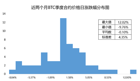 在专业的投资团队内,一般会根据历史数据计算出相应的涨跌幅概率,从而获取在相应显著性水平下的置信区间。如下图是OKex平台上近两个月BTC季度合约价格日涨跌幅分布图。为了方便起见,我们直接取历史数据中的最大值和最小值做为未来合约价格涨跌幅的估计区间,即预测未来一天内价格的变化区间在[-9.76%,12.02%]内,带入上爆仓线公式可得,为了有效防御未来一天内的爆仓风险,做多合约可选择的最大杠杆倍数为9.19,做空合约可选择的最大杠杆倍数为9.28,取整数后可知我们能选择的最大杠杆倍数为9倍。