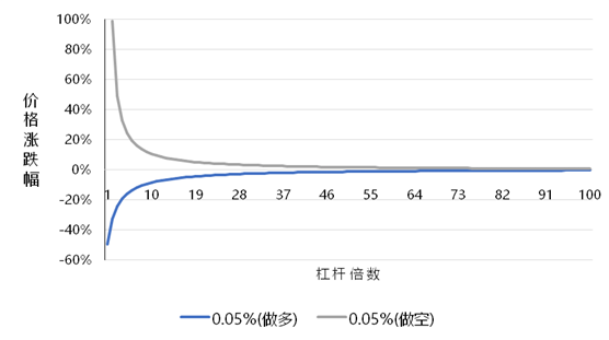通过爆仓线的公式,我们即可画出一条价格涨跌幅与杠杆倍数之间关系的曲线,如下图是在0.05%的维持保证金率下的价格涨跌幅与杠杆倍数关系曲线,在特定的杠杠倍数下,多方的价格跌幅在曲线上方,说明多方不会爆仓;空方的价格涨幅在曲线下方,说明空方不会爆仓,因此多空双方曲线的内部空间即代表安全区域。