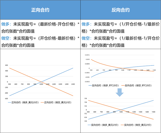 具体如下表,正向合约与反向合约由于计算收益的单位不同,所呈现的收益率曲线不同。但是将反向合约最终换算为美元单位时,两者收益并无任何区别。