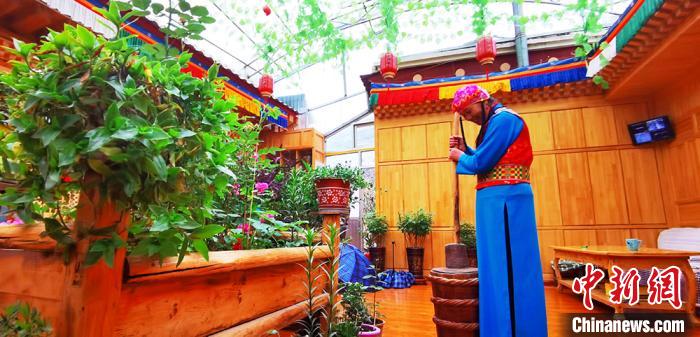 中新网兰州6月10日电 (魏建军 艾庆龙)初夏时节,53岁的甘肃省甘南藏族自治州卓尼县木耳镇博峪村村民高吉庆正为客人端上一碗碗“八宝茶”,妻子拉姆草在院里打酥油。除了让四海游客体验纯正的藏家风情,高吉庆还为游人讲述曾经在这里发生的“红色土司”帮助红军的感人故事。