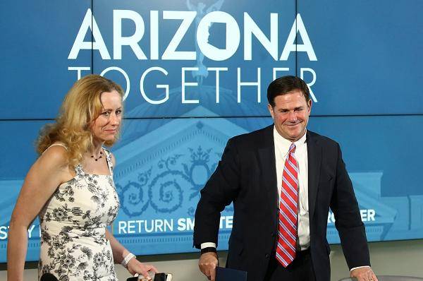 亚利桑那州州长道格·杜西(右)和州卫生服务部主任卡拉·克里斯(图源:美联社)
