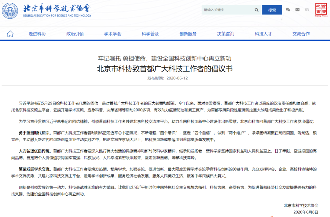 各团体会员单位、个人会员: 也许有个事实,还不大为众所周知。北京市科学技术协会(以下简称“北京市科协”)由学会、基金会、基层科协、区科协组成,自身没有个人会员。北京市科协通过学会、基金会等联系服务广大科技工作者;广大科技工作者参与学会、基金会的工作和活动,就是在为科协组织做贡献。 近日,北京市科协向首都科技工作者发出《牢记嘱托、勇担使命,为建设全国科技创新中心再立新功》的倡议,号召广大科技工作者积极共建北京科技交流主平台,为助力全国科技创新中心建设作出新贡献。 中关村认同应用技术跨界创新联盟作为北京市科协团体会员单位,积极践行“经理学术”理念,启迪学术思维、开展学术交流、服务创新发展,致力于为首都地区科技工作者服务,取得一定成效。特别是在疫情防控阻击战中, 中关村认同应用技术跨界创新联盟依托科技交流主平台,广泛开展云端学术交流、应急科普等活动,为首都取得阶段性疫情防控成果做出了积极贡献。这些成绩的取得,离不开广大会员单位和个人会员的积极响应和支持,得到了北京市科协的充分肯定和赞扬! 让我们积极响应北京市科协的号召,不忘嘱托,勇担使命,共同携手,奋发努力,为促进首都经济社会发展提供强有力的科技支撑,为建设全国科技创新中心再立新功! 中关村认同应用技术跨界创新联盟 2020年6月16日 北京市科协致首都广大科技工作者的倡议书: