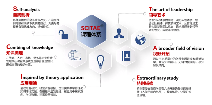 独创的SCITAE课程体系,通过自我剖析、知识梳理、应用启迪、领导艺术、视野开拓和特别辅修六大模块的有机结合,赋予香港公开大学MBA高管学员成长蜕变的强大能量。