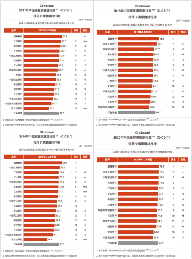 日前,品牌评级权威机构Chnbrand发布2020年中国顾客满意度指数(C-CSI)品牌排名和分析报告。招商银行信用卡通过探索与用户全新沟通方式、持续提升用户体验及生活方式,连续第四年摘得C-CSI顾客最满意信用卡品牌。