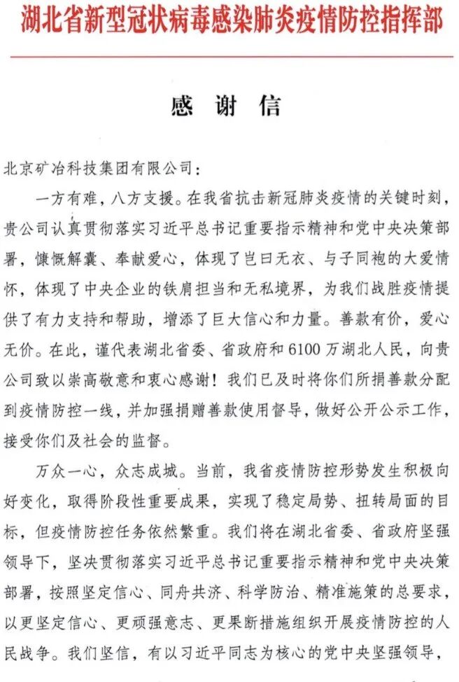 矿冶科技集团 抗疫行动 集团收到湖北省的感谢信 文章来源:矿冶科技集团官网 上海石化院 迅速落实集团公司“百日攻坚创效”行动