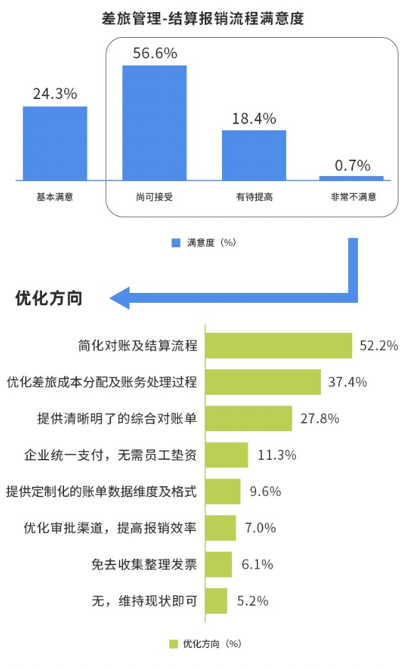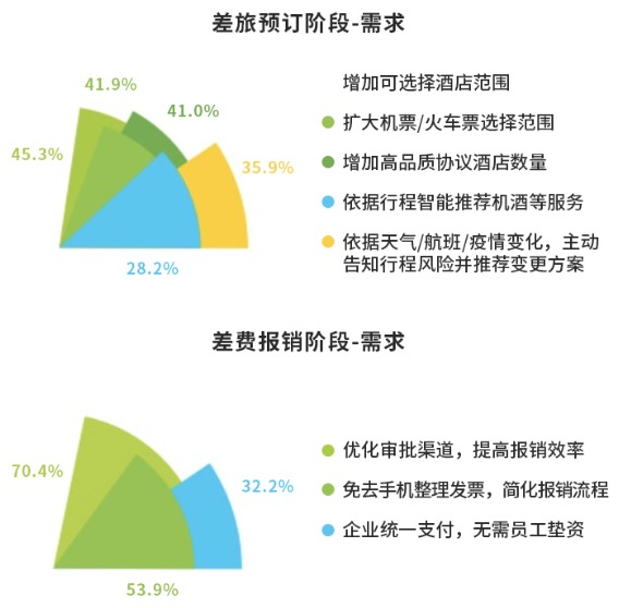 企业差费结算与报销管理方面,57%的受访者对现有报销流程基本满意但也认为还有一定提升空间如票据整理和查验、简化对账与结算流程及加快报销速度等,结合员工对企业内外需求来看,通过智能化的方式打通差旅前出行需求、成本分配与差旅的账单明细的结算通道,是提升报销体验和效率的关键因素。