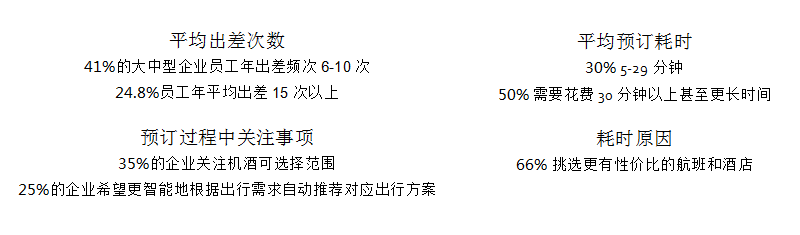 从数据推断,大中型企业企业平均每年需耗时168个小时(即7个工作日)进行差旅预订,每次出差预订耗时在5分钟以内不到7%,超过半数的企业正在耗费超过30分钟的时间处理差旅预定。单独模块的差旅预定服务已经无法匹配日益复杂的人群和业务需求,企业正在核心关注的是更具有性价比且令人充满惊喜的商务差旅体验。这个趋势越是在中大型企业,越具有显性特征,核心关键仍是降本提效和客户体验。