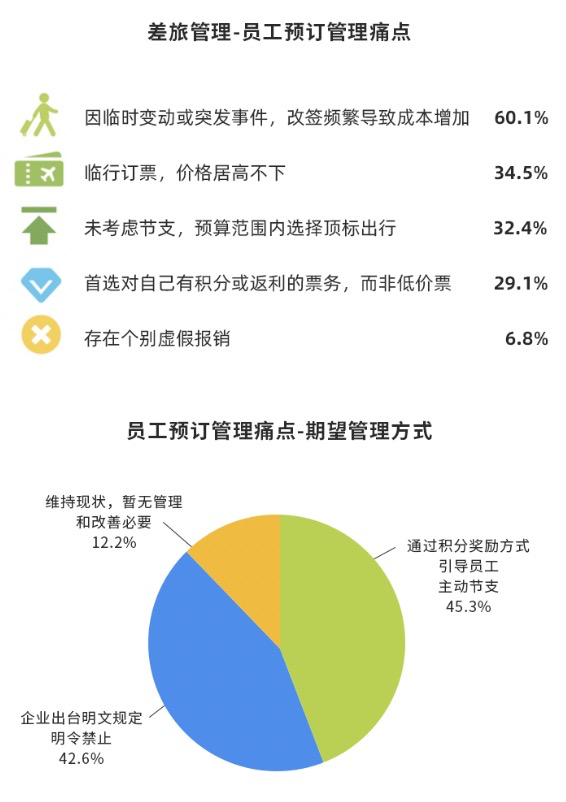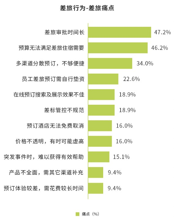 在此次调研中,“因临时变动或突发事件,改签频繁导致成本增加”高居榜首、成为所有受访企业最为显性的共同痛点。后疫情时代,降本增效成企业的经营管理的必要命题,然而实际操作中,业务需求引发的行程变更往往导致企业差旅行为管控与成本控制策略难以有效执行,是差旅支出高昂和超支的“元凶”之一,也是导致差旅管理流程体验下降的主要原因。