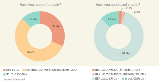 全球市场调研公司Macromill Group曾调查了 1万名日本民众,结果显示,88%的人都听说过比特币。此外,持币者中47%的人表示曾使用过比特币,大到买一栋日式别墅,小到买一杯清酒。