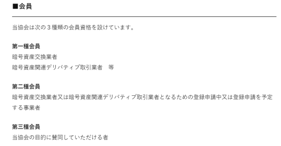 该协会组织共有三类会员,一类会员是已经通过金融厅审查拿到牌照可开展加密业务的交易所;二类会员是正在注册申请或者计划注册申请从事加密业务的交易所或企业;三类会员是该协会的支持者。