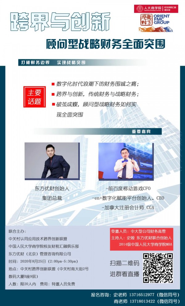 2020年8月25日,中关村跨界创新联盟将联合中国人民大学商学院校友财税汇融俱乐部、东方优财(北京)管理咨询有限公司共同举办“跨界与创新—顾问型战略财务全面突围”活动。