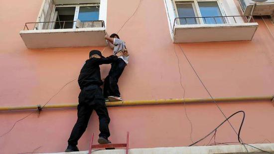警务人员 吐洪拜克・卡哈等人一边安抚孩子,一边从旁边搬梯子实施救助,5分钟后,将罗芳宇平安的从窗台上接下来,交给孩子奶奶。