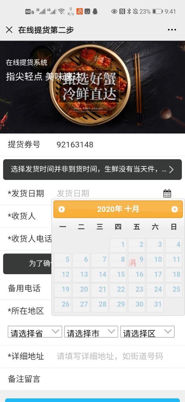 近日有消费者投诉苏州炘祺电子商务有限公司在京东售卖的阳澄湖大闸蟹提货卡根本无法提货,从卡片说明10月初开始提货,但是日期根本无法选择,按照提货的日期界面显示只有一天是满的,但退后一天到凌晨提货也是显示满字,根本无法选择日期。