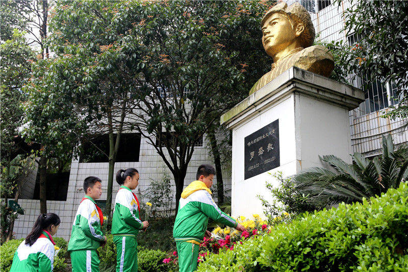 湖南吉首大学师范学院附属小学学生在为罗盛教烈士塑像献花(2016年3月31日摄)。新华社发(彭彪 摄)