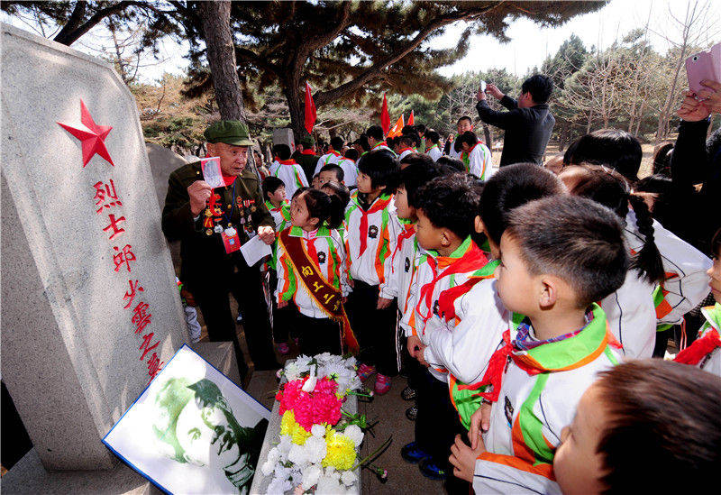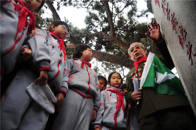 在沈阳抗美援朝烈士陵园,志愿军老战士李维波(左一)向学生们讲述邱少云的英雄事迹(2014年4月3日摄)。新华社发(张文魁 摄)