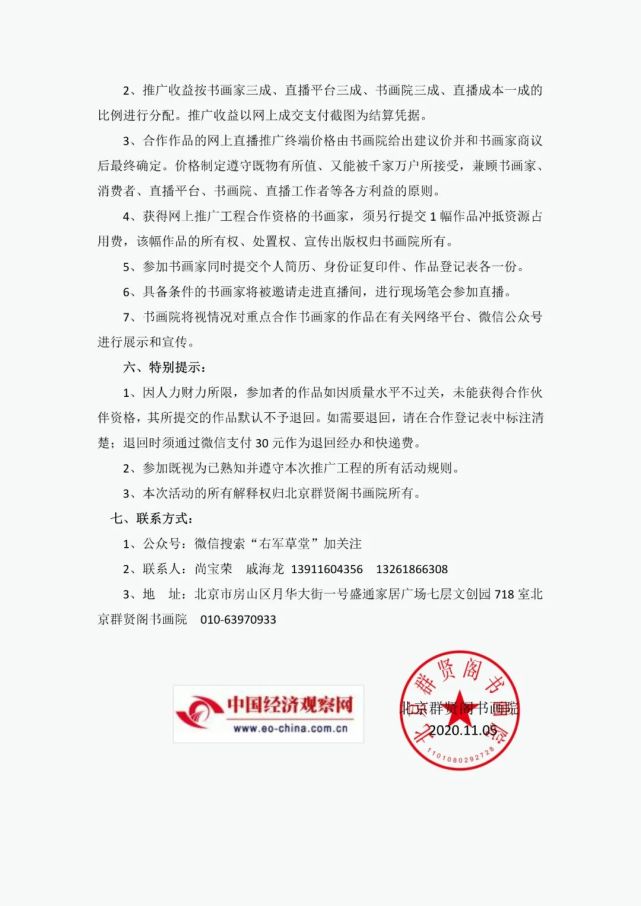 3、合作作品的网上直播推广终端价格由书画院给出建议价并和书画家商议后最终确定。价格制定遵守既物有所值、又能被千家万户所接受,兼顾书画家、消费者、直播平台、书画院、直播工作者等各方利益的原则。