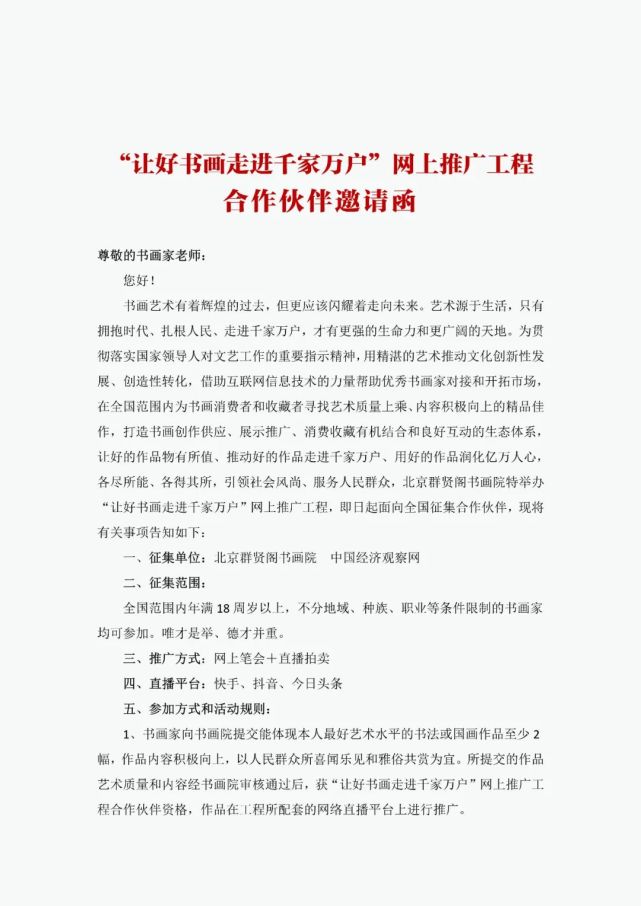 书画艺术有着辉煌的过去,但更应该闪耀着走向未来。艺术来源于生活,只有拥抱时代、扎根人民、走进千家万户,才有更强的生命力和更广阔的天地。为贯彻落实国家领导人对文艺工作的重要指示精神,用精湛的艺术推动文化创新性发展、创造性转化,借助互联网信息技术的力量帮助优秀书画家对接和开拓市场,在全国范围内为书画消费者和收藏者寻找艺术质量上乘、内容积极向上的精品佳作,打造书画创作供应、展示推广、消费收藏有机结合和良好互动的生态体系,让好的作品物有所值、让好的作品走进千家万户、让好的作品润化亿万人心,各尽所能、各得其所,引领社会风尚、服务人民群众,北京群贤阁书画院特举办“让好书画走进千家万户”网上推广工程,即日起面向全国征集合作伙伴,现将有关事项告知如下: