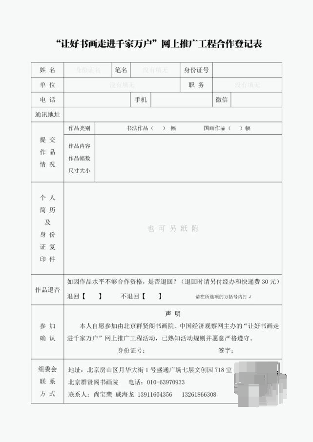 5、参加书画家同时提交个人简历、身份证复印件、作品登记表各一份。