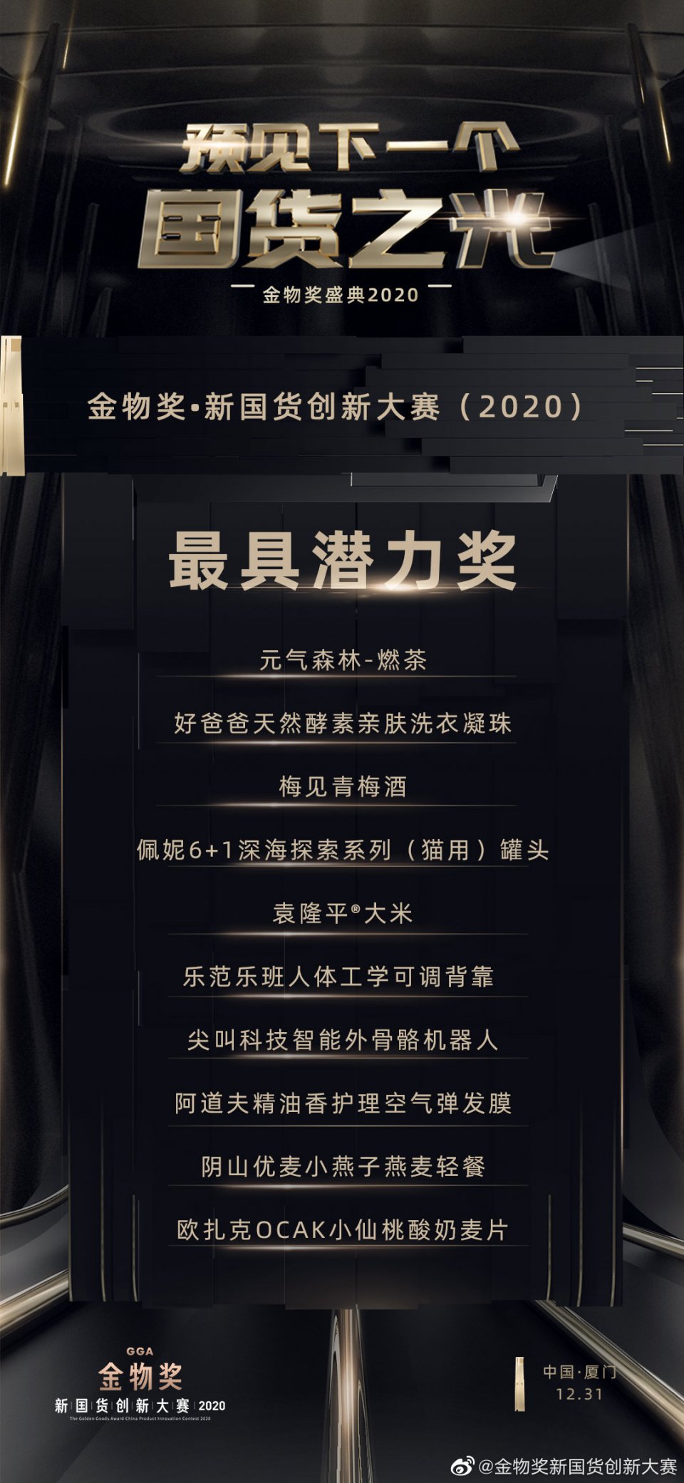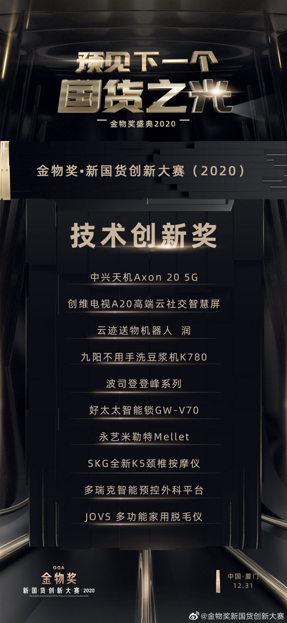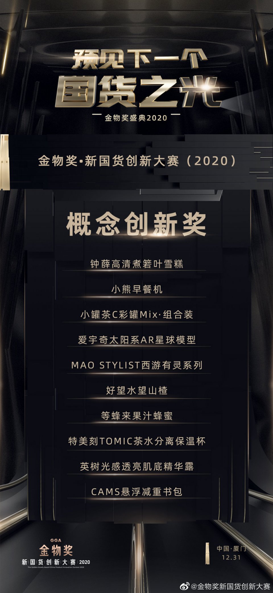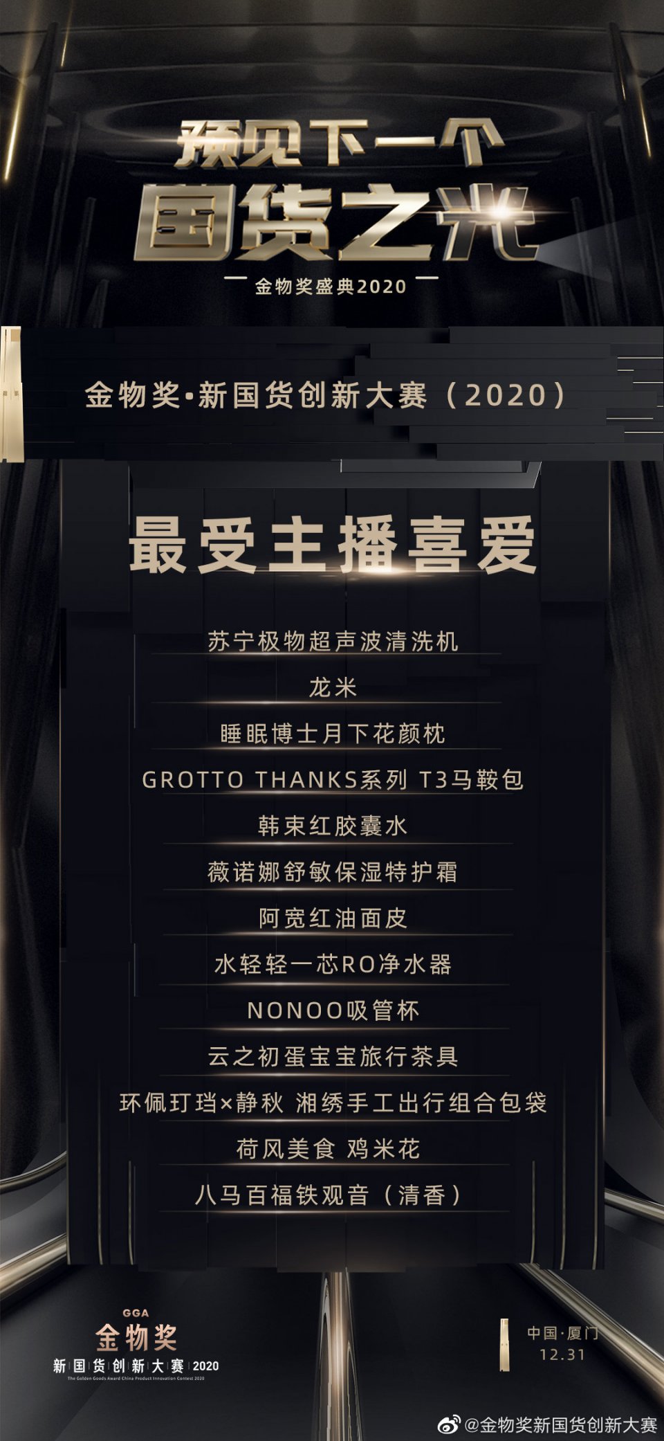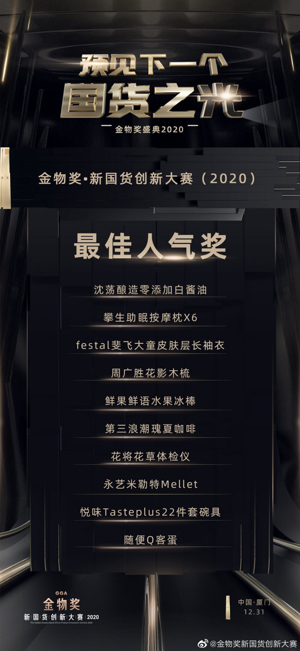 为了表彰在中国品牌崛起中,做出卓越贡献的中国好产品,金物奖 · 新国货创新大赛(2020)盛典在厦门举行。历时83天,经过42位全国评审团初选,9位终审委员会委员打分,共有86件产品获奖,这些产品分别摘得最佳设计奖、最佳营销奖、技术创新奖、最具潜力奖、概念创新奖、最佳人气奖、最受主播喜爱奖,以及金物奖金奖和金物奖新国货年度人物两大奖项。