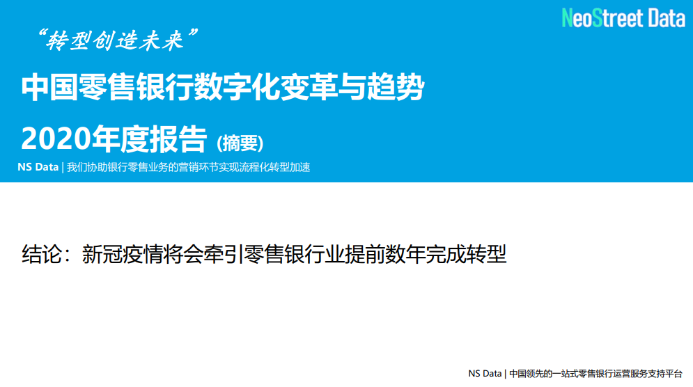 NSDC作为中国领先的零售银行运营服务支持方案服务商,一贯秉承「协助银行零售业务的营销环节实现流程化转型加速」的企业使命和初衷,持续耕耘零售银行数字化转型服务市场,开辟创新的一站式解决方案。此次《中国零售银行数字化变革与趋势2020年度报告》的重磅发布,对于引领和推动当下零售银行业的转型发展至关重要。未来,NSDC还将继续以“转型创造未来”的创新姿态,顺势而为,助力零售银行激发业务和团队潜能,打造独一无二的竞争力。