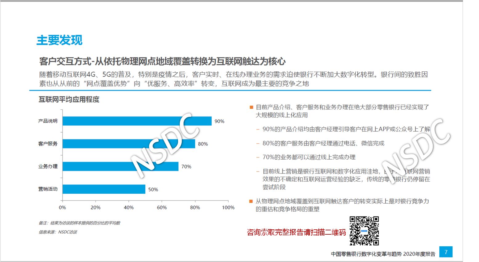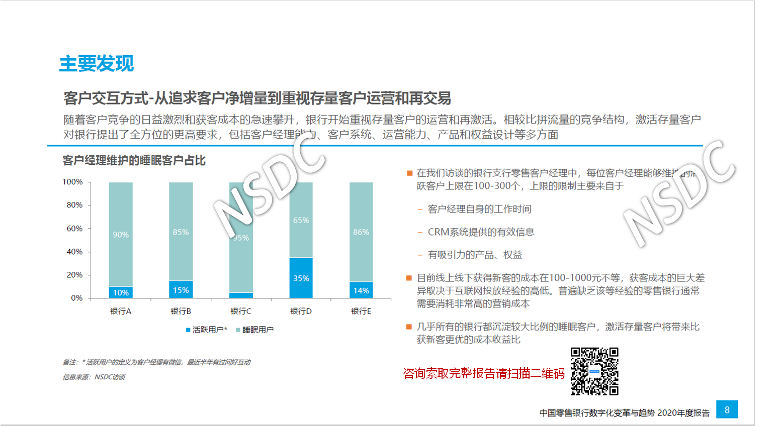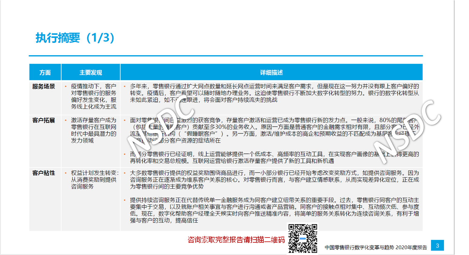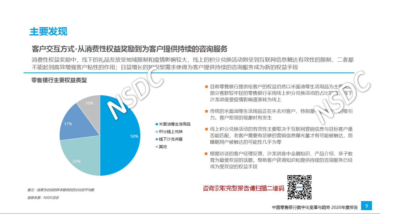 据悉, 本次报告基于国内商业银行零售金融条线一线从业者的调查结果,以及对业内高管的访谈而形成,今年NSDC还首次针对商业银行零售业务的客户群体开展了服务意见调查。这些“客户洞察”贯穿本报告全文。两项调查的开展时间均为2020年10月上旬至12月下旬。