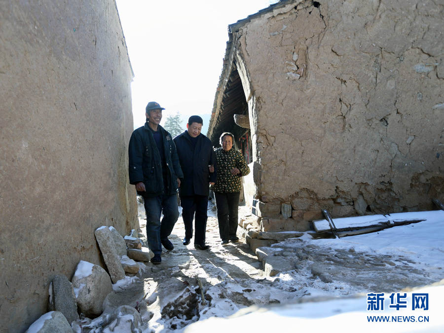 这是习近平在龙泉关镇骆驼湾村踏雪到困难群众唐宗秀家看望。新华社记者兰红光摄