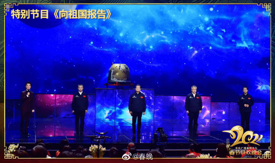 在特别节目《向祖国报告》中,四名航天“总工”走上舞台,向祖国汇报,向人民汇报那关于星辰宇宙的征程!
