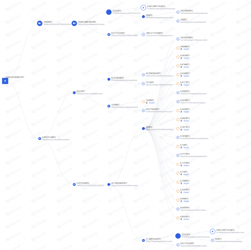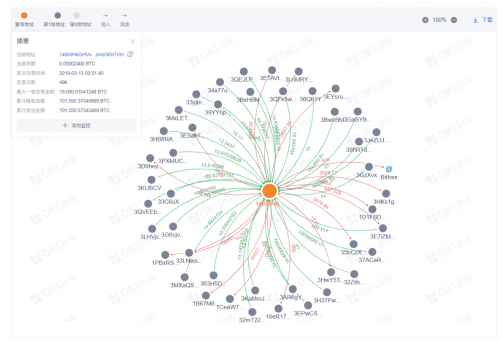 而后将该地址输入「交易图谱」,可以查看其是如何将大额资产分散并进行洗白。