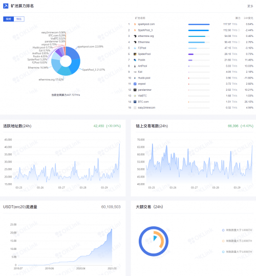 欧科云链OKlink 不仅包含比 特 币和以太坊区块浏览器,还提供了莱特币、BCH、DASH、Bitcoin SV、USDT、ETC 和 OKExChain 及测试网的数据,从常规的基础数据,包括全网算力、难度、奖励、区块高度、市值、流通量、交易量、TPS,同时,矿池算力、富豪地址等用户关心的数据,也都已经实现了数据可视化。