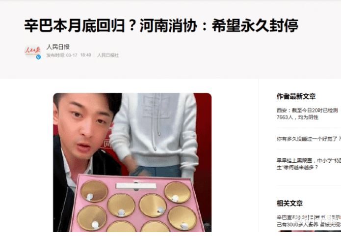 而近日,一篇标题为《辛巴本月底回归?河南消协:希望永久封停》的文章发布,该文章发表后,许多重要官媒都进行了转载。其中包括但不限于《人民日报》《红星新闻》等重要权威媒体,表明这些权威媒体和河南消协对于辛巴欲复出,是持明确反对意见的。