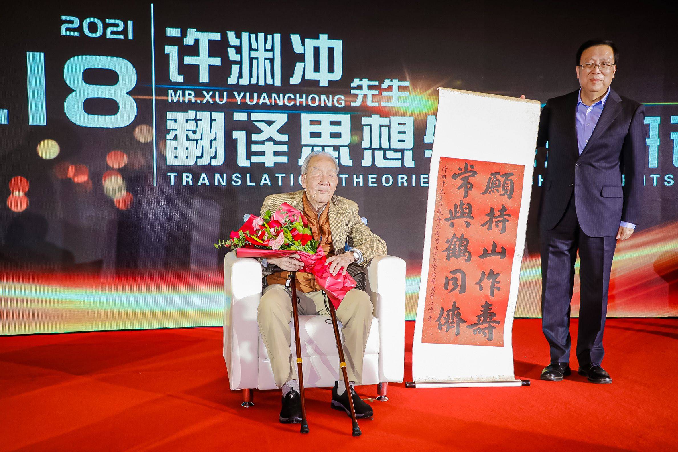 北京大学校长郝平向许渊冲送上鲜花和礼物。 主办方供图