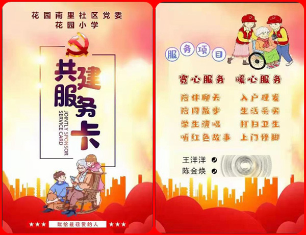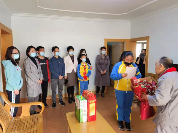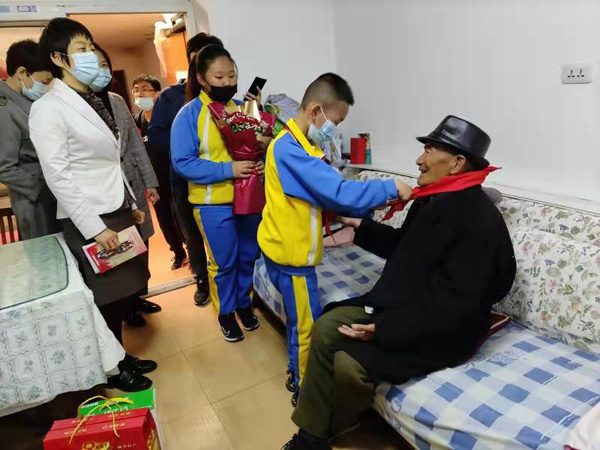 两位少先队员为老人戴红领巾,敬礼,诵读慰问信,献花。两位书记为老人送上注明“陪伴聊天,陪同散步,学生演唱,听老红军回忆往昔,采买生活用品,理发,打扫卫生”的贴心服务卡。两位老人从青年时期开始往后的大部分光阴都是在部队里度过的,把自己的青春都献给了祖国。今天,我们愿把问候与服务送给老军人,让他们享受和平年代的幸福。