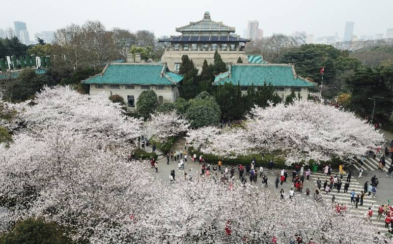 2021年3月13日,武汉大学抗疫医护人员赏樱专场启动,来自全国各地的援鄂抗疫英雄在樱花树下重逢,尽享樱花之约(无人机照片)。 新华社发