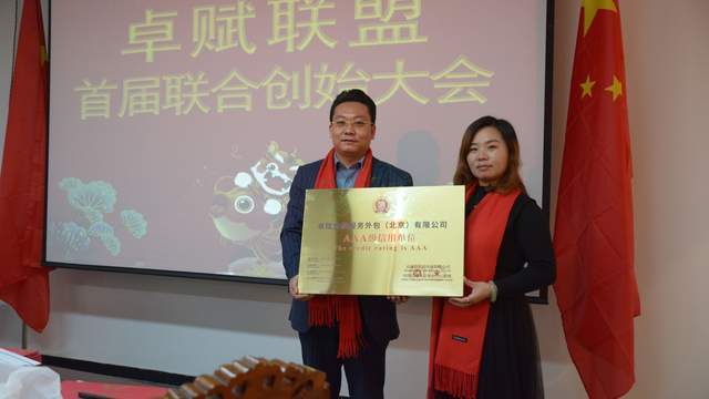 众诚达信用评价有限公司代表雷晓梅女士为卓赋李恩铧总颁发AAA及信用单位证书并合影留念