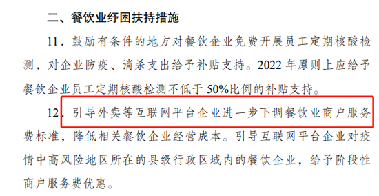 在餐饮业纾困扶持措施中,提出要引导外卖等互联网平台企业进一步下调餐饮业商户服务费标准,降低相关餐饮企业经营成本。引导互联网平台企业对疫情中高风险地区所在的县级行政区域内的餐饮企业,给予阶段性商户服务费优惠。