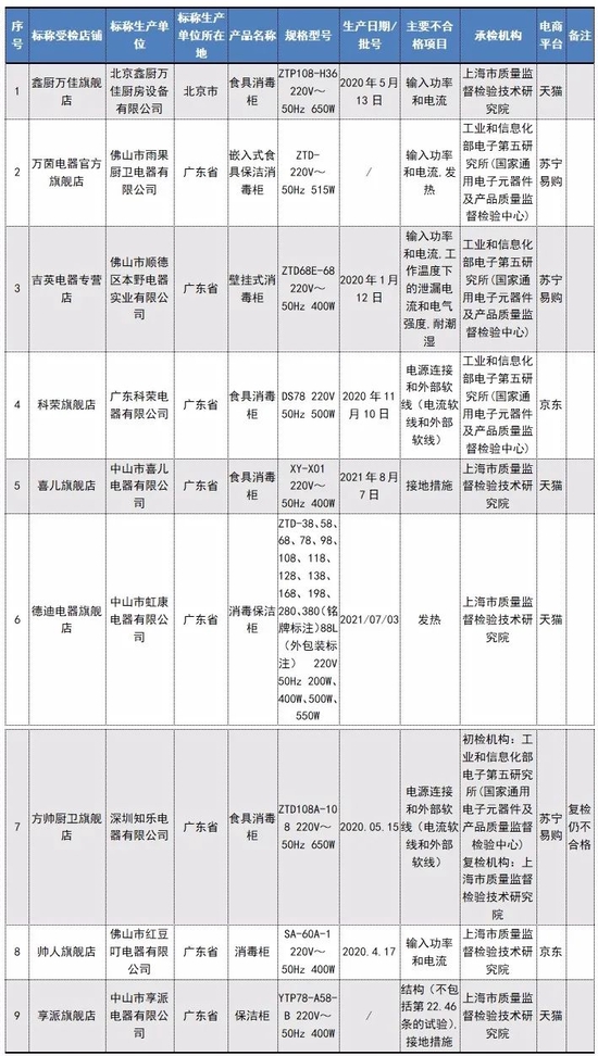 本次抽查了6个省(市)58家生产企业的59批次食具消毒柜产品,其中2批次涉嫌假冒,已交由企业所在地市场监管部门处理。