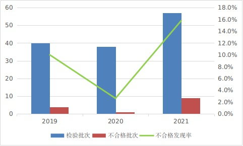 检验的57批次产品中,发现9批次产品不合格,不合格发现率为15.8%,较上次抽查上升13.2个百分点。