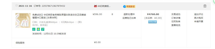 徐先生称,2021年11月16日,他在天猫华妃燕旗舰店分两笔订单购买了价值1万多元的燕窝,“当时店里推出免费试饮活动,即可以免费试吃,不满意可以退款不退货。”