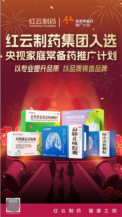 红云制药集团股份有限公司创立自2017年,是一家集研发、制造、营销于一体,具有较强竞争力的新兴医药工业集团,已连续两年荣获“中国OTC生产企业综合实力百强企业”。红云制药始终坚持匠心品质,真诚服务国民健康,多次参与各项公益活动,深受国民信任!凭借着强厚的企业实力和优秀的品牌力,红云制药旗下共有5款产品成功入选CCTV-6《家庭常备药》品牌推广计划,分别是清肺抑火胶囊、绞股蓝总苷胶囊、毛萼香茶菜清热利咽片、隔山消积颗粒、益肺止咳胶囊。